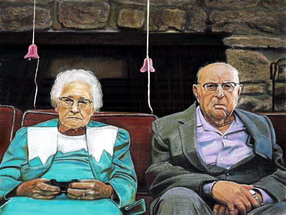 There is nothing like an elderly couple. Wouldn't ya just love to listen to what they have to say here? Outstanding work on this...it is another "wow" drawing. They are so cute...makes me smile looking at them.