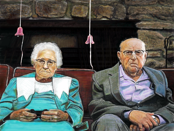 There is nothing like an elderly couple. Wouldn't ya just love to listen to what they have to say here? Outstanding work on this...it is another "wow" drawing. They are so cute...makes me smile looking at them.