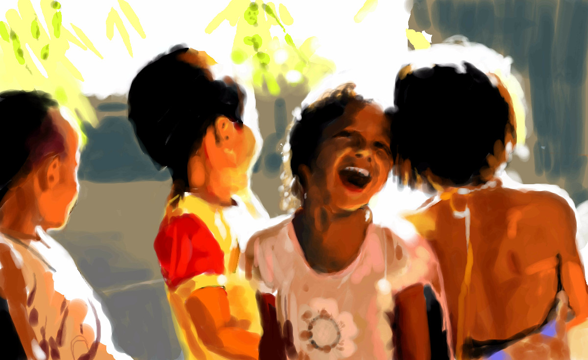 I appreciate this work very much. There's one tiny point that my eye keeps going to and I don't want it to go there. The second girl from the right...the oblong circle on her neck. I know...it's supposed to convey something, but it's distracting to me. Love love love the light and the laughter.