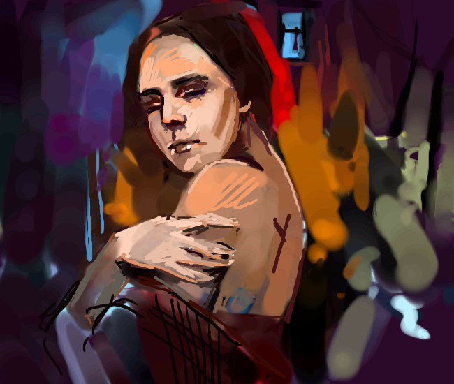 and although it's repressed, her anxiety is clearly shown through the solid strokes, even the flames are calmer than her. It's actually a little bothering piece, with everything that is going on..