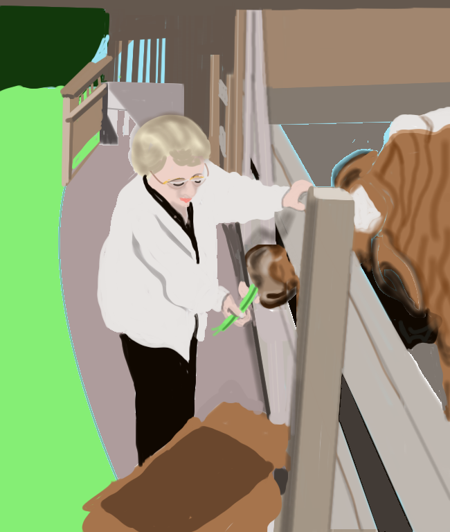 this is me at a petting zoo, I have lost 100 pounds through bariatric surgery and still need a walker to get around, it is taking me a long time to draw this because of tremors in my right hand