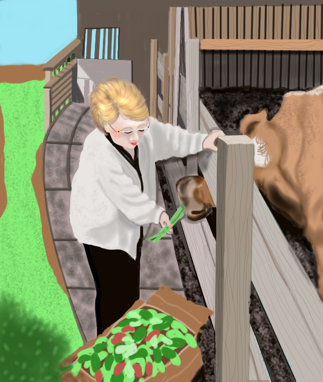 this is me at a petting zoo, I have lost 100 pounds through bariatric surgery and still need a walker to get around, it is taking me a long time to draw this because of tremors in my right hand
