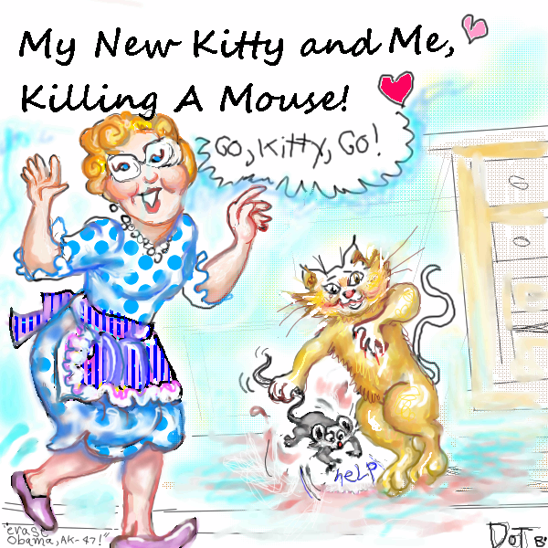 (THIS WILL BE A SUGARY-SWEET card or picture, that usually artists draw of a cat and his owner, frolicking together, in friendship.; so the characters are drawn nice and sweet, and with little hearts (how many of those have you seen and gotten sick of?") but the whole action belies the picture of the nice owner and her new sweet cat; they are bonding,. by killing a mouse together! uggh. its a satire of cats, pets, and their owners little nice friendship cause the reality is, if the woman has mice in her kitchen (been happening lately) her new cat will find it, play with it ruthlessly, and whack itt utilll its dead; and probably present it to the new owner. I had a "temporary" cat, who lived with me a while, and right away, she killed a big "scrap" bluejay, and put it at my feet, saying "this is for you to eat" (she expected me to eat it.) I know that those cat associations, and pro-feral cats-clubs, want to tell everyone that kitties should all be saved, even the feral ones, like they are innocent little angels; they are not. they are still primative predators, that kill birds and other small critters, squirrels, ect. But this huge PETA trend, to save predators, so much, and pretend they are not real animals. is really delusional. Even dogs started out as companions to man, because they hunted for food together, working together. some idiots even imported MORE DOGS TO HERE, from CA! California, which does not want them!! THAT IS HOW CRAZY the people are here!!I like animals, and want to save them, but we need to ship a lotta dogs to Vietnam, (or was it the Philipines?) cause they eat dog there!! this is the result of many many crazy, nuts, bum-people who cause trouble for ALL OF US, by breeding cats and dogs no one wants.(besides the feral ones, which humans dumped outside, too.) i really want to give them all an artistic kick in the butt. I will finish later, too much right now. ( for some reason, i can see a series of pictures of nice cartoons, and pets in horrifying situations. pitbull attacks. I just might do sadistic, cute cartoons like this, just for the dark humor. example, pet pythons getting loose in Florida, in the wilds; they're multiplying like rabbits there.so, isn't that cute? no, its not. its now a health hazard, i hear, there. we have this rodent, called a "nutria" here, in Eugene, OR, wild, which was let loose by people , who bred them for their fur. but now, hunters just kill them. sheesh. Nutria fur is made into fashionable clolthing now!! and they shoot them like rats here! Yeah, well, thats my point. people and their pets, are not taking care of them; and we're stuck with tons of them. Oregon people act like cavemen a lot. ugh. I could use some feedbzck; whats the opinion of my dark humored, sadistic, sweet pet pictures?? i'm warped, aren't i? hah. just a fan of "Planet of the Apes" movies. I love em. let me know, good or bad, just any feedback is fine. i do wanta make it neater, like the hp hewlet packard one. watercolor, if i can. but dark humour, even BLACK, is one of my favorite things, :) ---sincerely, dorothyblueeryes