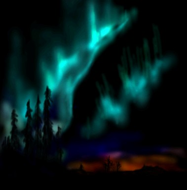 ok it`s the northern lights um... the things in the left hand corner are tall trees sticking up the green stuf is the northern lights & the orange & red thing in the right hand corner is the sun set & the stuf sticking up in front of the sun set are more trees but small because they are in the distance