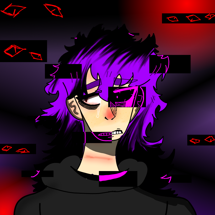 There. I present to you a new character. 2draw, Meet Ash Suzuki!! This drawing took SO damn long. But I think it's a bit much. While they're crying black tears, they have a bloody nose, bleeding neck and mouth while there are eyes in the lil glitches I put. But at the same time, I feel like it gives some detail to the character. But the feeling I got when i set this drawing to finished, I was so damn happy that I was finally done with this. Lemme know what you guys think about it. bye <3.