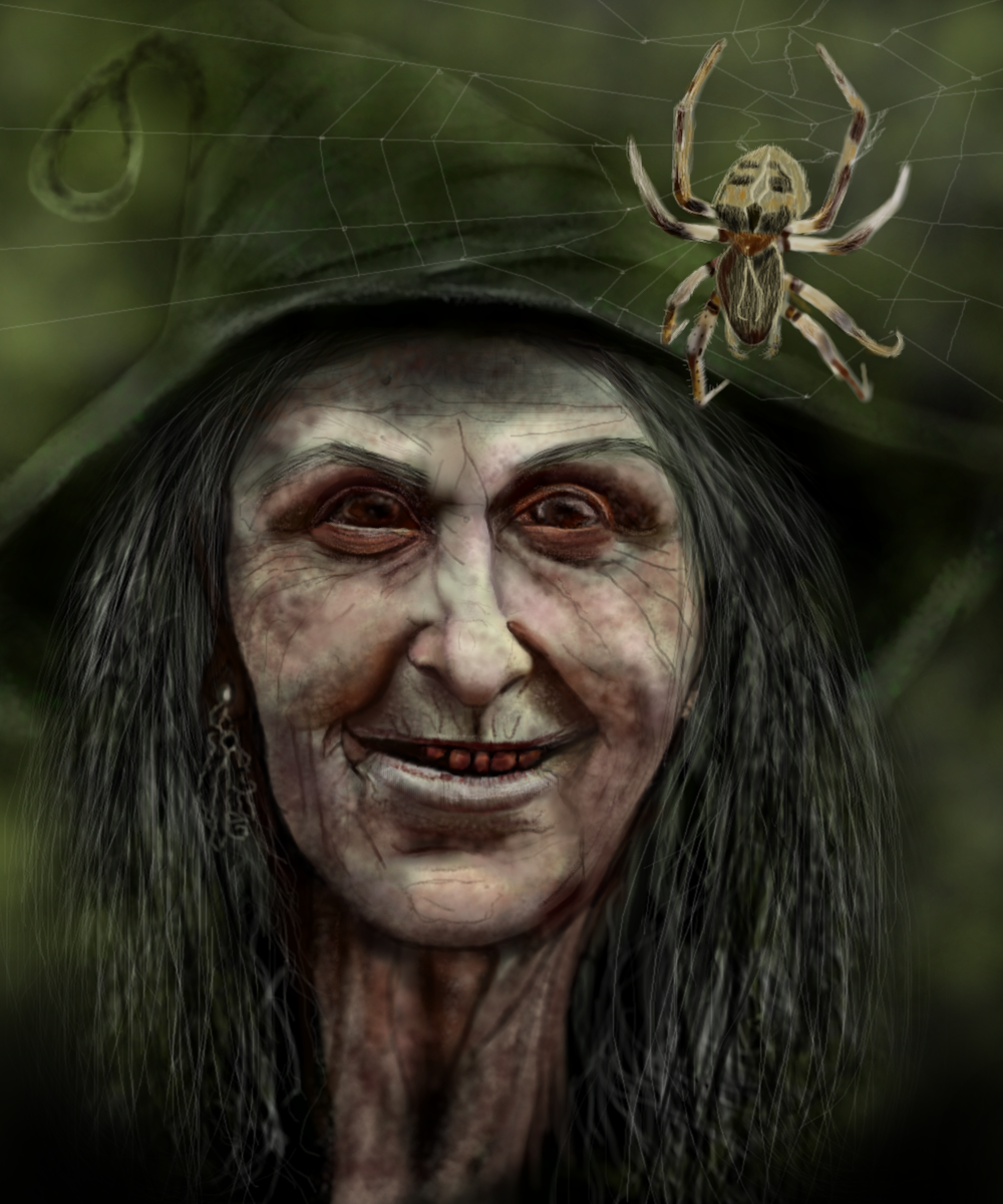 A witch I created and didn't like hat so tried to revise, didn't like next one so added spider.