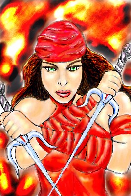 My choice is my bow and arrows, (or in a drastic situation my .44 mag), but she can use those if she wants. :) I like the fiery background and the way you depicted her green eyes.
