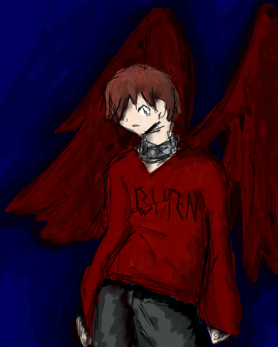 Ah! I'm rubbing off on you! lol, jk jk I like the position hes in, kinda tipped ta the side The pants are sweet! but I think the face is too small, and are the wings supposed ta come outta his neck? O.o? I dunno Anyway, nice n.n