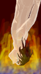 And as for the hair. He's not hanging, he's falling (hence the title), when you're moving swiftly in any direction your hair is usually blown in the opposite direction. So, his hair wouldn't be hanging down unless he stopped moving, right?