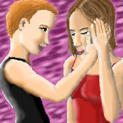 It's cute, and I like the idea, but the girl with the red shirt's face is a little off - try shortening her forehead and maybe giving her more shaped lips? Anywho, the whole pic is really awesome - and in one sitting, too!