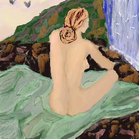 I think the tub would take away from the idea.. her hand looks like its crushed between those rocks..maybe put a little pool in that area and move her forearm back a tad so the pool looks like a pool and not an extension of the waterfall.. I think some pale pink or yellow lilies up there in the white triangle to the left might be nice too. I like this..