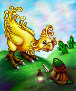 Chocobo: Did I hear you right? A race?Tonberry: uhhuh Chocobo: Well, if you are sure. Tonberry: . . . one step forward . . . Chocobo: last chance to back out and save your reputation Tonberry: . . . one step forward . . . Chocobo: All right, you're on. Tonberry: uhhuh. Chef Knife: click-clack Chocobo: (muttering) I'm gonna make him suffer. Tonberry: (muttering) Chicky will never know what hit him.