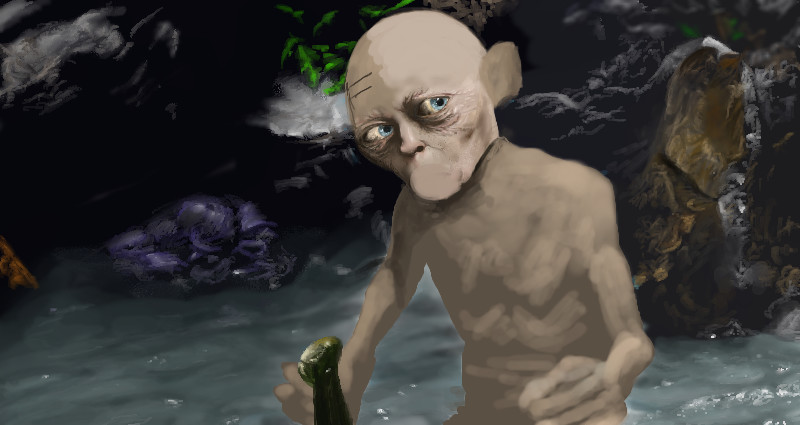 i wanted to do a pic of him where he's got his smeagol eyes..this is as close as i found.i think this is when faromir makes frodo call gollum up from the forbidden pool of whatever : )