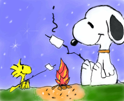 Hey, Snoopy reassembled Woodstock^^!Woohoooooo!!!And now they're having smores XD.Snoopy better not get any ideas about having some cooked birds tonight...
