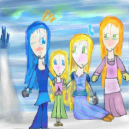 From Left to Right: Neptulia, Tia, Myraila, Floria.It's a family photo of Neptulia and Myraila, two royal sisters, their Grandmother, FLoria, and Myraila's mysterious "Hope Child", Tia. Myraila really wanted a daughter, but it was impossible, so one night, she prayed to the stars, and Tia just... Fell to her. True resemblance, too. Well, it's not too great, but I sort of like it!