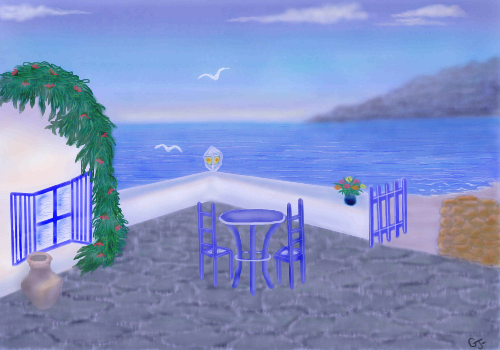 There is one thing missing from this picture... ME! I am sitting at that table eating things wrapped in grape leaves, drinking wine and checking out hot Greek guys (while going by my given name, Cynthia, which just happens to be Greek. :) edit: this is very well-done.. exceptional composition and my favorite thing is the greenery on the wall (just one teeny tiny thing... maybe a bit of a shadow under the table and chairs would sort of "hold them down" to the patio)