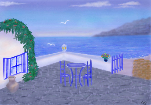 There is one thing missing from this picture... ME! I am sitting at that table eating things wrapped in grape leaves, drinking wine and checking out hot Greek guys (while going by my given name, Cynthia, which just happens to be Greek. :) edit: this is very well-done.. exceptional composition and my favorite thing is the greenery on the wall (just one teeny tiny thing... maybe a bit of a shadow under the table and chairs would sort of "hold them down" to the patio)