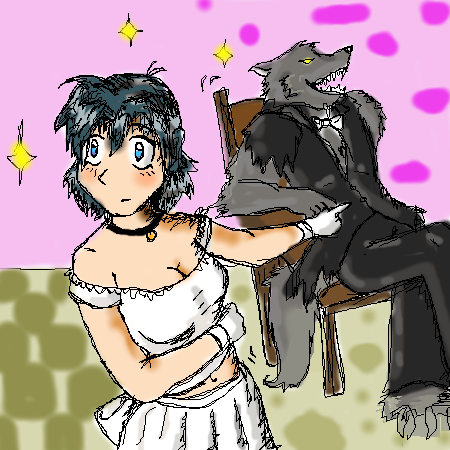 Ack...I don't know what to make her freaking out about....Update: Crappy background, and I put her darling husband casually talking on a chair. XD