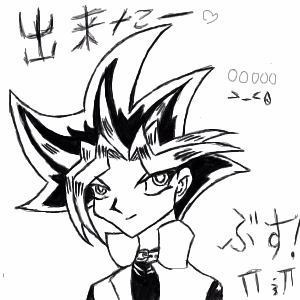 Remind me to never, ever try drawing Yami Yugi. >< I did this as a present for my friend, hope she likes it...(The Yami fangirl that she is...)Fear my horrible kanji/hiragana. XD