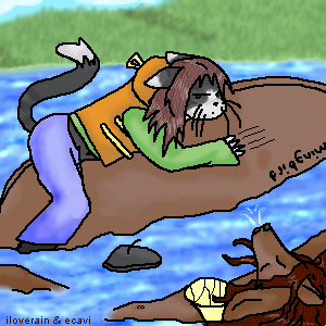 It appears to be me and ecavi on a lake, in a canoe, or were... and i tipped it and i <3 canoeing and TL (ecavi) dosent.. xD lol... Silly kitty.... She'll prolly laugh at this. There is a hat in the water, cause her charater wears a french hat thing.. >_<; hehe!!