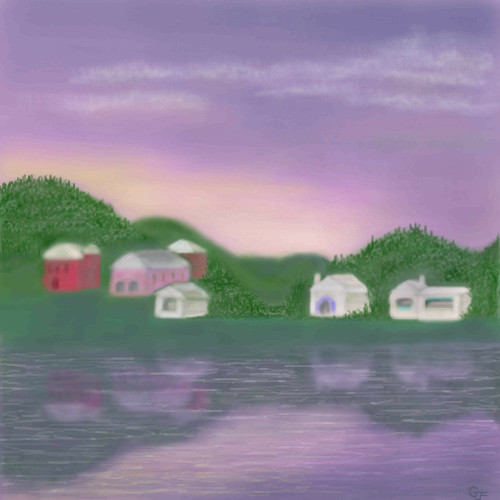 I think it's very pretty. The colors in the sky are so soft and light; very wonderful. The lake looks good too, but I think it looks more like it's frozen than a lightly moving liquid lake. Unless it was meant to look frozen; then it's good. :) But I think to make it look more free-flowing, you should not make the reflection look so neat and straight, and also add just a few darker tones in the water. Good job, though. :)