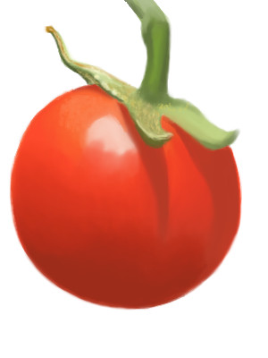 Definitely improving with your realism.The stem looks a bit plastic-like (can't put my finger on just why that is...sorry I can't be of help there :( ), but the tomato itself is VERY well done.You've got the core shadow, the reflected light, and texture all down.The water drops are looking nice too :).