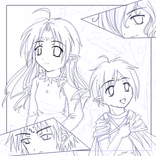 Elf children in a forest, along with random people on the sides (mainly to cover up the girl's hand so I don't have to draw it XD). Pointy ears are fun. *nodnod* ^^;