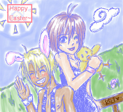 Happy (belated) Easter! :3 This is really a cute picture. I like their hair. :D And that cloud.. is awesome o.o