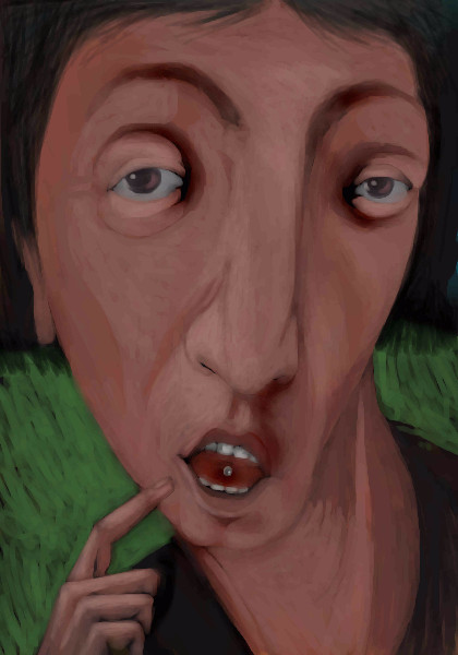 just got tongue pierced - wants to show of new found bravery. I like your body concious characters, good use of finger pointing. nice composition.