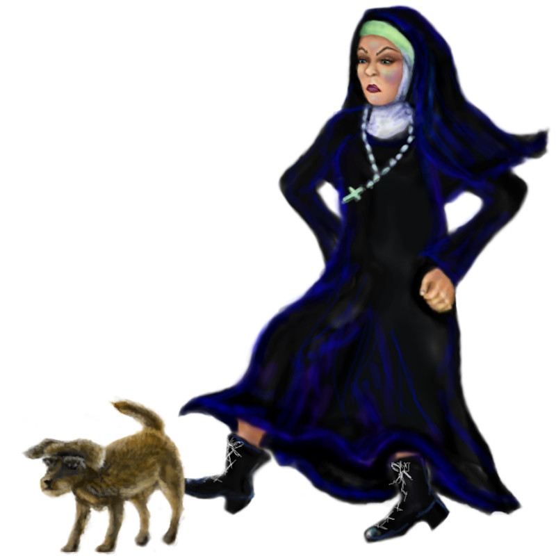 Haha! Nice drawing! She is kicking the dog in the bum! Hehehe, I like nuns, they look sexy! >:)