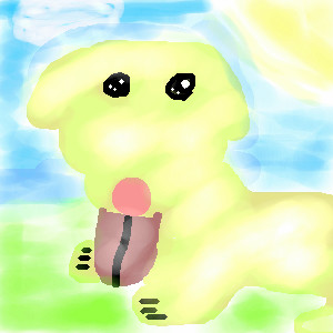 That's a dog?! I thought it was a blob. Just kidding. Is that a sun over there on the right? I thought it was a lemon. Just kidding. Is that its clown nose? I thought it was licking a cherry. Just kidding. You call that a tongue? I thought it was... nvm. Btw, the toes are melted. hehe Just kidding again. Is it on dry land or a marshland? lol Didn't think it was grass. Just kidding. Well so far, you got the sky and the cotton ball cloud and the puppy's eyes. Everything else... look a bit puzzling. You should... work on it some more.