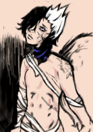 OK, what i see is his body is kinda slump if you know what i mean. If not, just ask. Notice the curve of his body. Notice how is chest is turned slightly to our left, and his hips are turned a little more to the right.. not much of a difference though. now i'm not sure what you want to do with the left arm. I think that it wouldn't be so stuck out.. it would be more "hanging" like. Since hes in a slump positon. His eye I think shouldn't be raised. Now i'm not the best in anatomy, but I know that your forehead takes up some room on your head. Like, you have some forehead before you reach the eyes.. You don't want your eyes to be on your forehead. I Love the facial expression of course. Don't I always? And i really like the hair. I hope that helps, anymore questions just ask me! ^^
