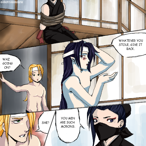 Hey look! Its Keisuke and Kuan again... story? hummm... Keisuke, after several battles with Kuan, decides that since he keeps getting his butt kicked he would just submit to Kuan. Kuan, grateful he doesn't have to keep rebuilding his house, yard, ect. offers to teach pathedic Keisuke a thing or two and takes him on as apprentice. However, their first night together (yesh, that sounds bad. >_<') is interupted by a thief, which Kuan was quick to tie up. I may change her design later. I don't really like it right now.