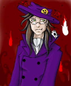 This is Guane He takes his chips BBQ style. He`s a gambeler/supernatural investigator /BBQ flavored chip addict/ Idiot. Yea he `s really stupid he thinks glowing green eyes & a talking hat are normal o.O o yea his hat `s name is Ned ...He talks. XD Edit I`m strange I just made that whole thing up lol o yea he`s eating bbq chips that`s y his face/mouth look funkatated
