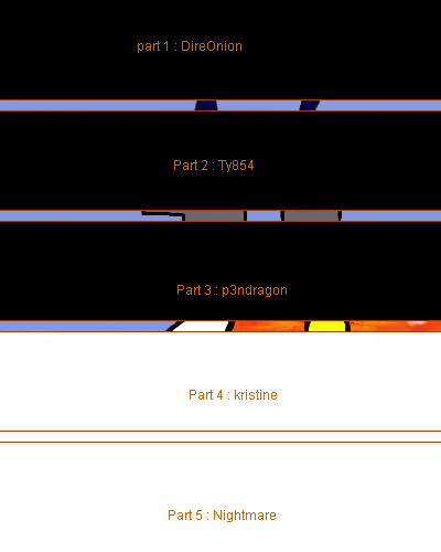 Hi, lets make an exquisite corpse! This site explains how the game works. In this online version of the game, each player draws a 400x100 piece of the canvas and obscures it, leaving only a 10-pixel sliver for the next player to continue the image from.-The first layer is the template for the exquisite corpse. You may make it invisible, but don't bother adding your name to it, I'll do it. -The second layer is the one obscuring the other drawings. Here you must draw a black rectangle over your drawing, even if it's incomplete. Don't make it invisible, you'd ruin the game ;) -Merge your layers once you're done to save space and avoid confusion. -And don't look at or paint over the other players' layers! Part 1: DireOnion - DONE Part 2: Ty854 - DONE Part 3: p3ndragon - DONE Part 4: kristine - DONE Part 5: Nightmare - DONE