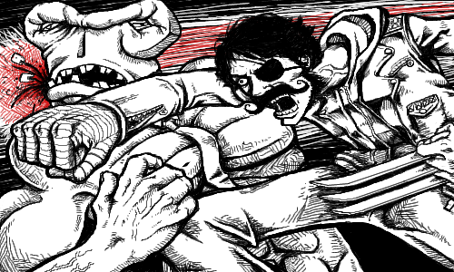 Couldn't get the right kind of brush strokes with this applet to do a Frank Miller type picture. So instead you get a picture of Brick Stone kicking the shit out of Senator Dirk Manchest. [Epiglottis]