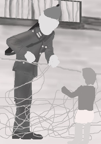 "Dieses Kind will hinüber. Der Posten hat Befehl, niemand durchzulassen. Trotzdem öffnet er den Draht. Wegen seines Vergehens wurde der Posten sogleich abkommandiert."From a postcard I bought at Haus Am Checkpoint Charlie...