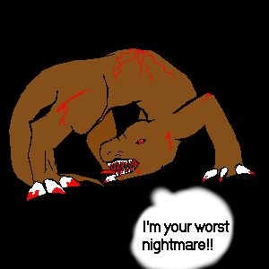 this is another one of my creature! Bloody! Bloody was my second creature that I made up. He spits blood at his enemys giving them horrid visions and then it makes them go blind. Bloody are always oozing blood from their mouth. The smell of their blood is so strong that even a human can smell it from miles away! The smell of their blood is even strong enough to make you vomit because it smells like a rotting corpse! well I hope you like it! (I spelled nightmare wrong... I must fix that)