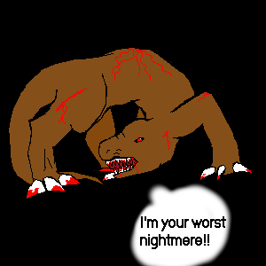 this is another one of my creature! Bloody! Bloody was my second creature that I made up. He spits blood at his enemys giving them horrid visions and then it makes them go blind. Bloody are always oozing blood from their mouth. The smell of their blood is so strong that even a human can smell it from miles away! The smell of their blood is even strong enough to make you vomit because it smells like a rotting corpse! well I hope you like it! (I spelled nightmare wrong... I must fix that)