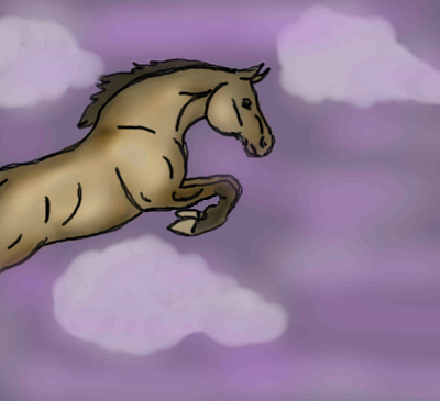 The horsey is flying not jumping.I dont know why the sky is purple.n_n