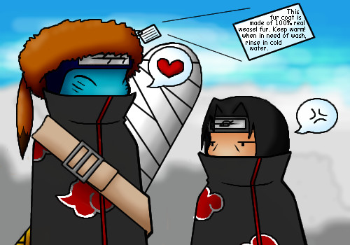 lol XD cute. *pets Itachi's head* =3 *then pokes kisame's new hat* XD this is so adorable, I like your style =3