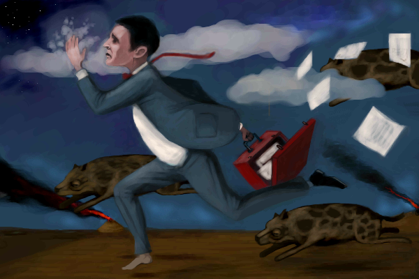 Nooo he's an insurance agent rushing to an anthill fire! This is great you guys.
