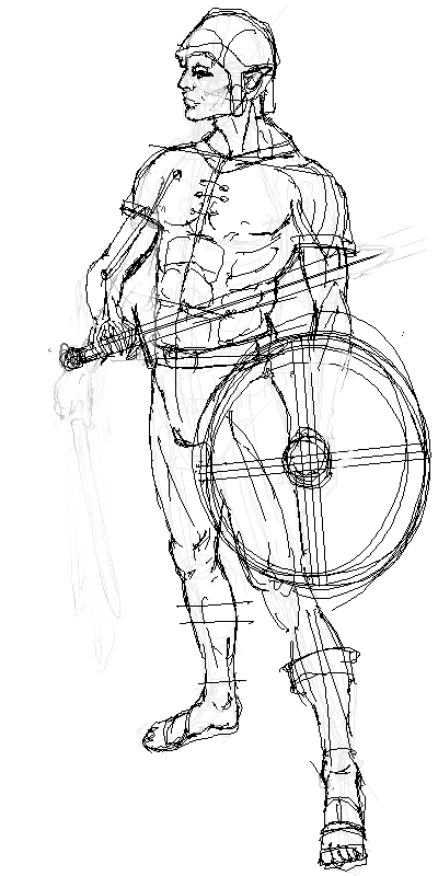 HunterKiller: the straight lines on the right leg are indicating where the boots might be placed if I go with boots instead of sandals. I think I'm going to go with sandals, but I started off wanting to do boots (since I generally have trouble with feet). The one on the waist is just something I started out with before drawing the waist to indicate how the front plane of his pelvis is tilting with respect to that straight line across the shoulder. I tried to do get like a contrapposto thing going for a sense of balance. And then the pair of straight lines across his abdomen are just a reminder of how the front and side planes of his torso are arranged in perspective.