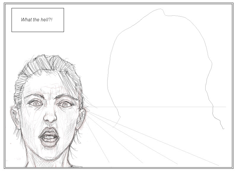I wanted it to be kind of suspenseful about what might happen next, which is why I went with the whole, "What the hell?!" setup. I think just about anything could go behind her: a space ship, a martian probing a cow, a monster, a naked person running around, etc.