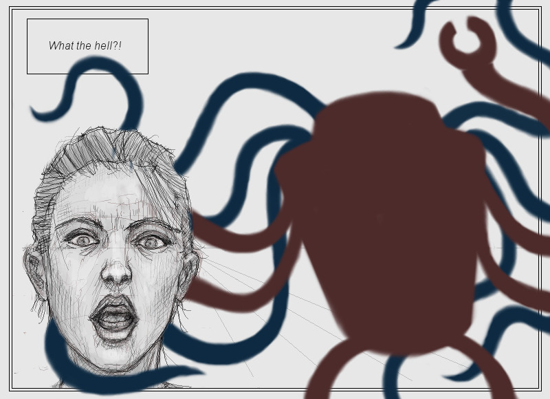 I wanted it to be kind of suspenseful about what might happen next, which is why I went with the whole, "What the hell?!" setup. I think just about anything could go behind her: a space ship, a martian probing a cow, a monster, a naked person running around, etc.