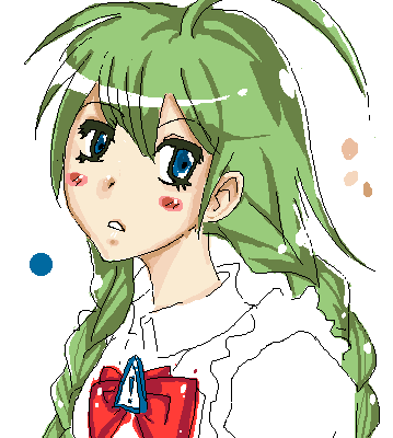 She has green hair like Midori X3 I love her outfit, especially the pin on her ribbon X3 I could get one and stick it on my forehead...