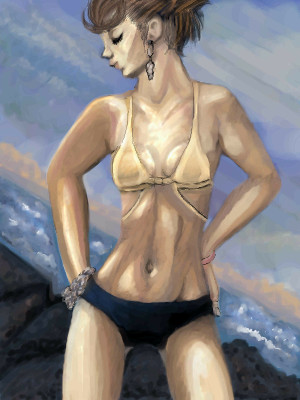 Although it almost looks like you rushed on coloring parts, like the right arm, [her left] and it almost seems as too much of the abdomin is dark.