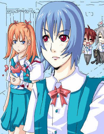 wow...this is beautifully done! i LOVE the lil' chibi Shinji and Kaoru in the background. they = rabu! <3 and rei looks really good, as does asuka's expression. it suits her very much. hehe