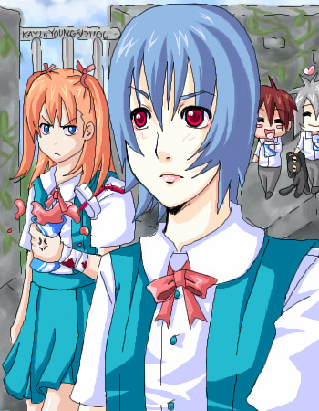 wow...this is beautifully done! i LOVE the lil' chibi Shinji and Kaoru in the background. they = rabu! <3 and rei looks really good, as does asuka's expression. it suits her very much. hehe