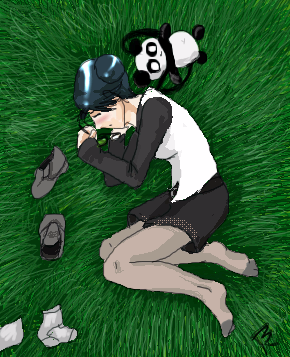 Looks so sad, poor thing. I like the glow of her hair and the way you did the grass going out. And aw that panda is cute.